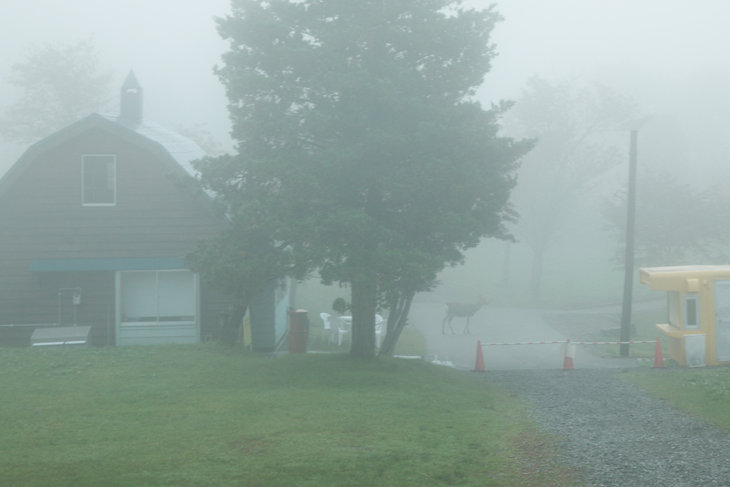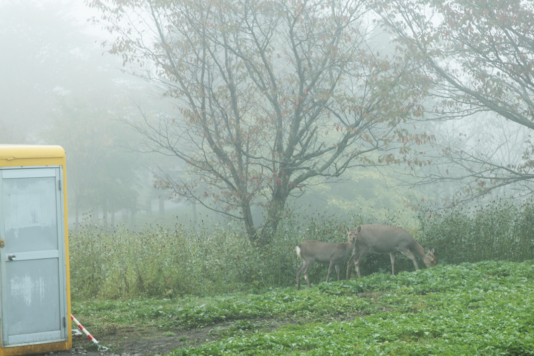今回初日、夕張に入って真っ先に来たのですが 朝霧に包まれていて、視界が非常に悪く、 撮影は厳しかった。 誰もいない施設内ゆっくりと歩く鹿の親子。 此方を何度も見ながらも逃げないのは 人間慣れしているのかな。