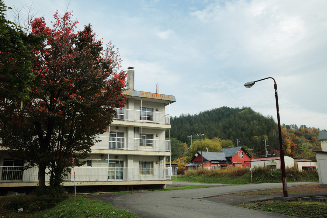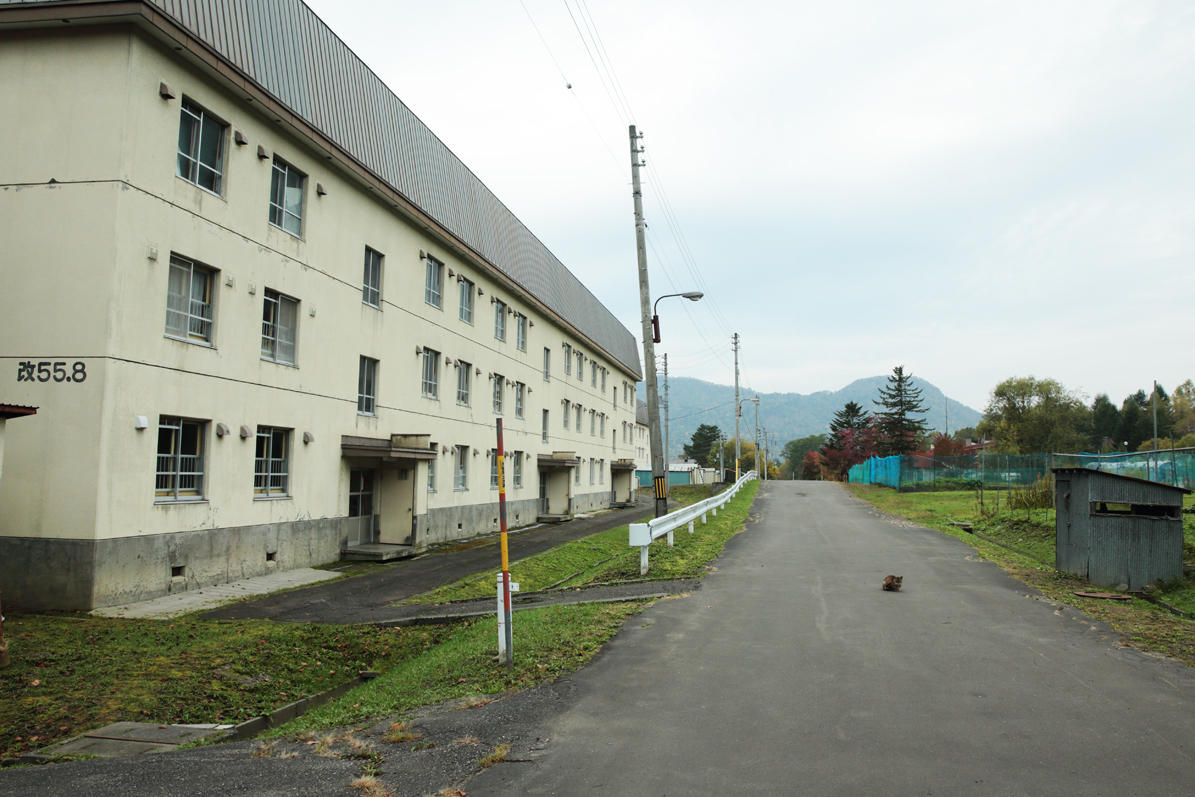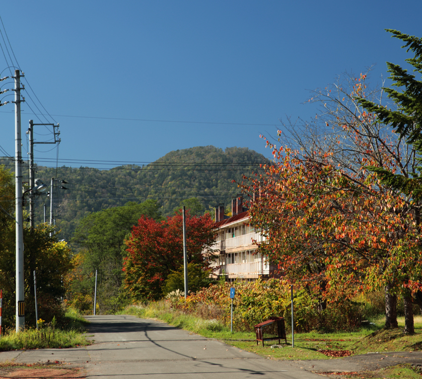 右には六区のバス停、六区の炭住、公園、