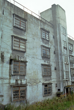 写真中央にブロック製の六軒長屋がありその向こうに2階建てのコンクリート製の
